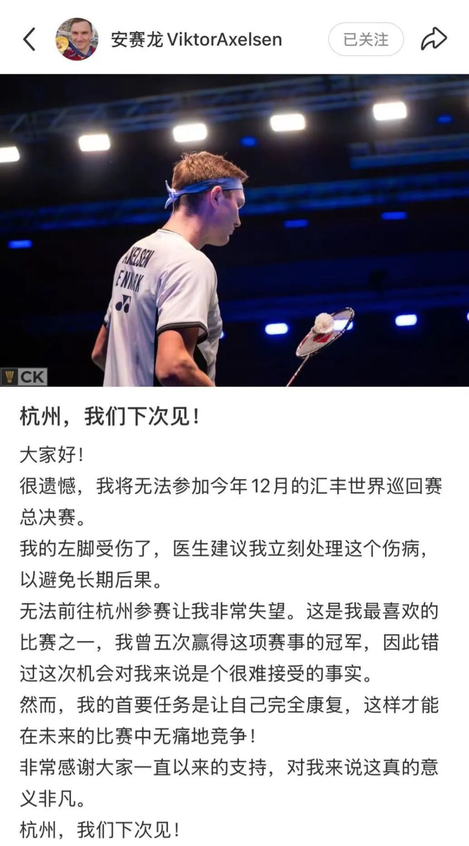 无法前往杭州参赛让我非常失望。这是我最喜欢的比赛之一,我曾五次赢得这项赛事的冠军,因此错过这次机会对我来说是个很难接受的事实。